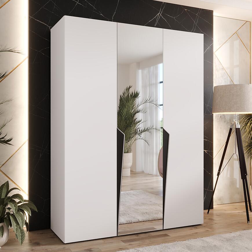 Szafa Piano 2-150 biały/czarny – nowoczesna, trzydrzwiowa szafa z lustrem, 150 cm szerokości. Białe fronty w połysku, matowy korpus, elegancka i pojemna do sypialni lub garderoby.