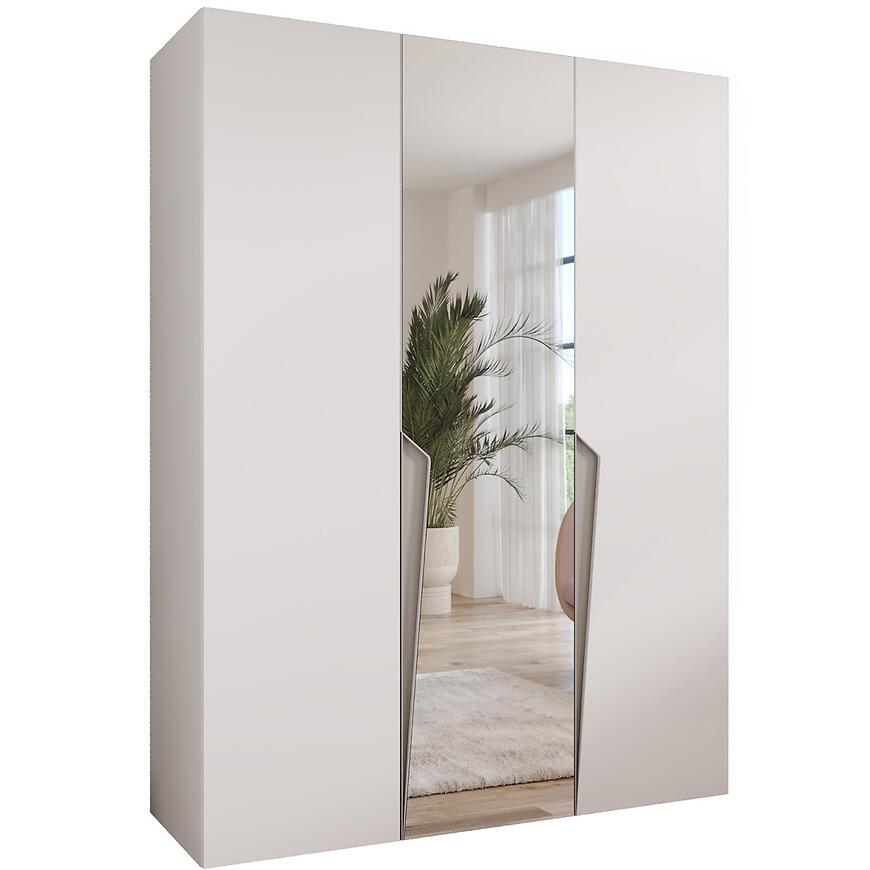 Szafa Piano 2-150 biały/kaszmir – nowoczesna trzydrzwiowa szafa z lustrem, 150 cm szerokości. Połyskujące białe fronty z kaszmirowym akcentem, matowy korpus, elegancka i funkcjonalna do sypialni lub garderoby.