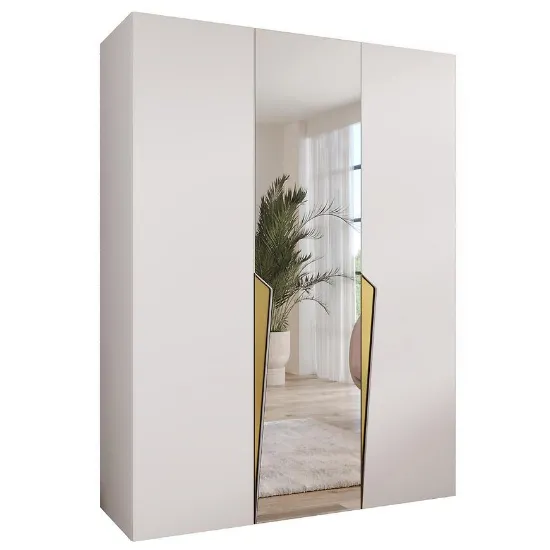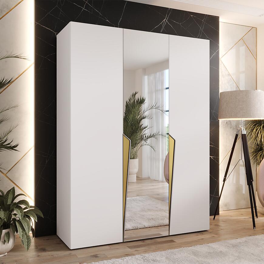 Szafa Piano 2-150 biały/złoty – nowoczesna trzydrzwiowa szafa z lustrem, 150 cm szerokości. Połyskujące białe fronty ze złotym akcentem, matowy korpus, elegancka i funkcjonalna do sypialni lub garderoby.