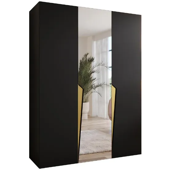 Szafa Piano 2-150 czarny/złoty – nowoczesna trzydrzwiowa szafa z lustrem, 150 cm szerokości. Czarne fronty w połysku ze złotym akcentem, matowy korpus, elegancka i praktyczna do sypialni lub garderoby.