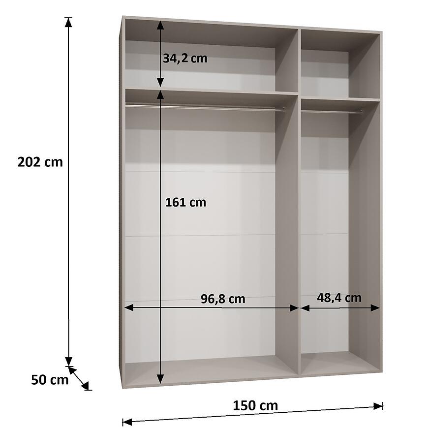 Szerokość 150 cm, wysokość 202 cm i głębokość 52 cm zapewniają komfortową przestrzeń do przechowywania ubrań, pościeli i dodatków. Trzydrzwiowa konstrukcja umożliwia wygodny dostęp do wszystkich segmentów szafy i logiczny podział wnętrza.