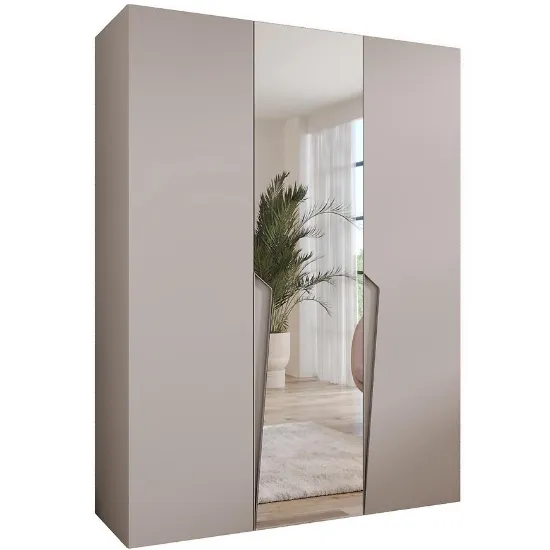 Szafa Piano 2-150 kaszmir/kaszmir – nowoczesna trzydrzwiowa szafa z lustrem, 150 cm szerokości. Połyskujące fronty w kolorze kaszmir, matowy korpus, elegancka i praktyczna do sypialni lub przedpokoju.