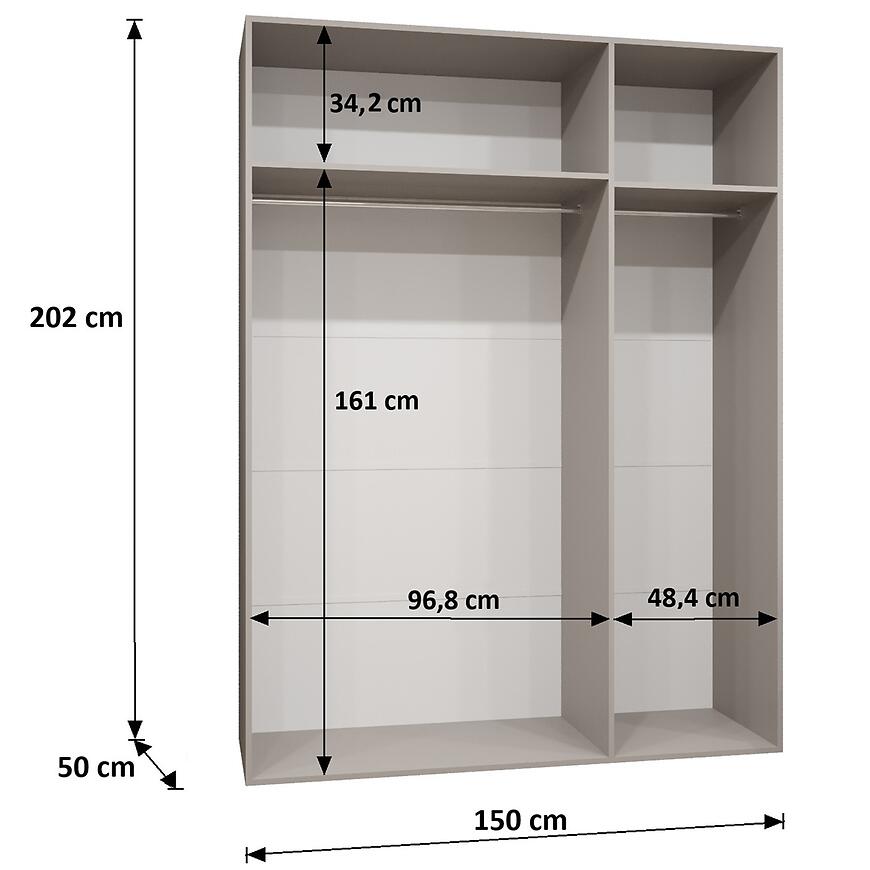 Szerokość 150 cm, wysokość 202 cm i głębokość 52 cm zapewniają wygodną przestrzeń do przechowywania ubrań, pościeli i dodatków. Trzydrzwiowa konstrukcja umożliwia logiczny podział wnętrza i komfortowy dostęp do wszystkich segmentów szafy.