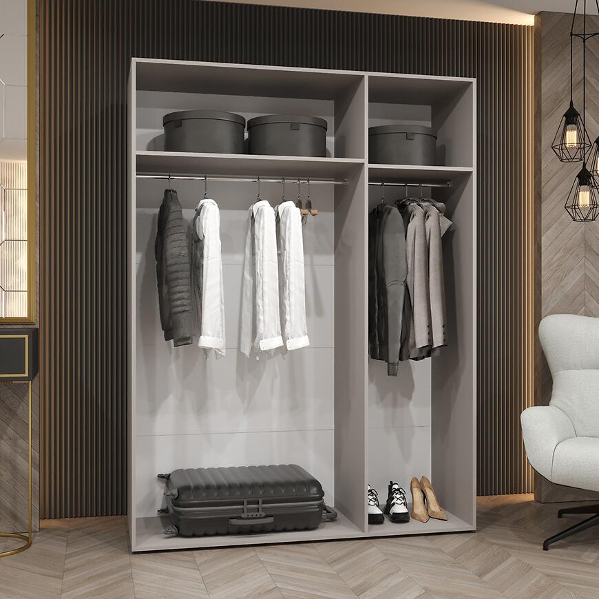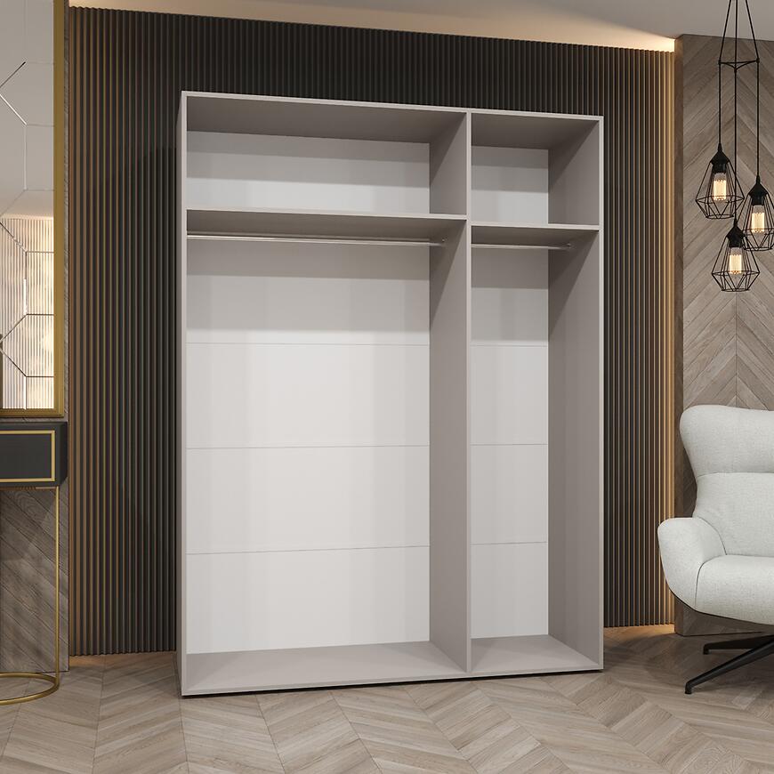 Szafa Piano 2-150 kaszmir/kaszmir łączy elegancki wygląd z praktycznym wnętrzem. Lustro eliminuje potrzebę montażu dodatkowego wyposażenia, a przemyślany układ przestrzeni ułatwia utrzymanie porządku. To idealny wybór dla osób ceniących nowoczesny design, funkcjonalność i elegancję.