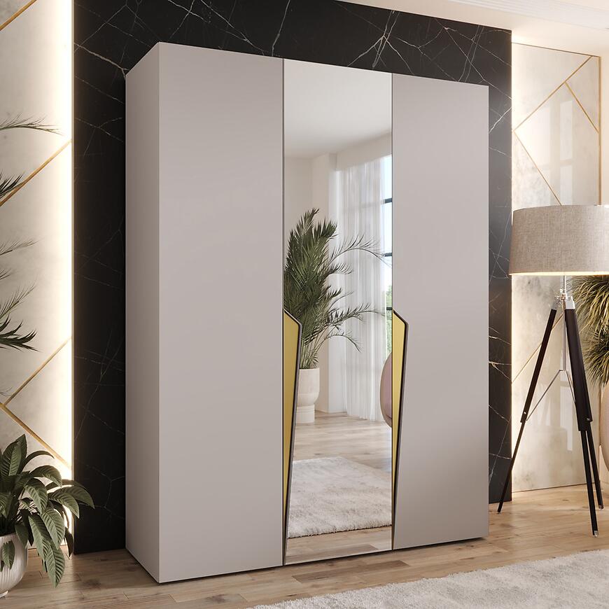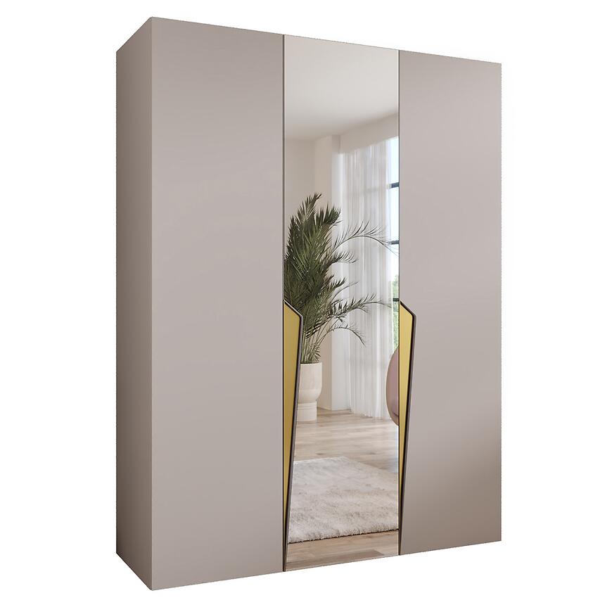 Szafa Piano 2-150 kaszmir/złoty – nowoczesna trzydrzwiowa szafa z lustrem, 150 cm szerokości. Fronty w połysku w kolorze kaszmir z eleganckim złotym akcentem, matowy korpus, funkcjonalna i stylowa do sypialni lub przedpokoju.