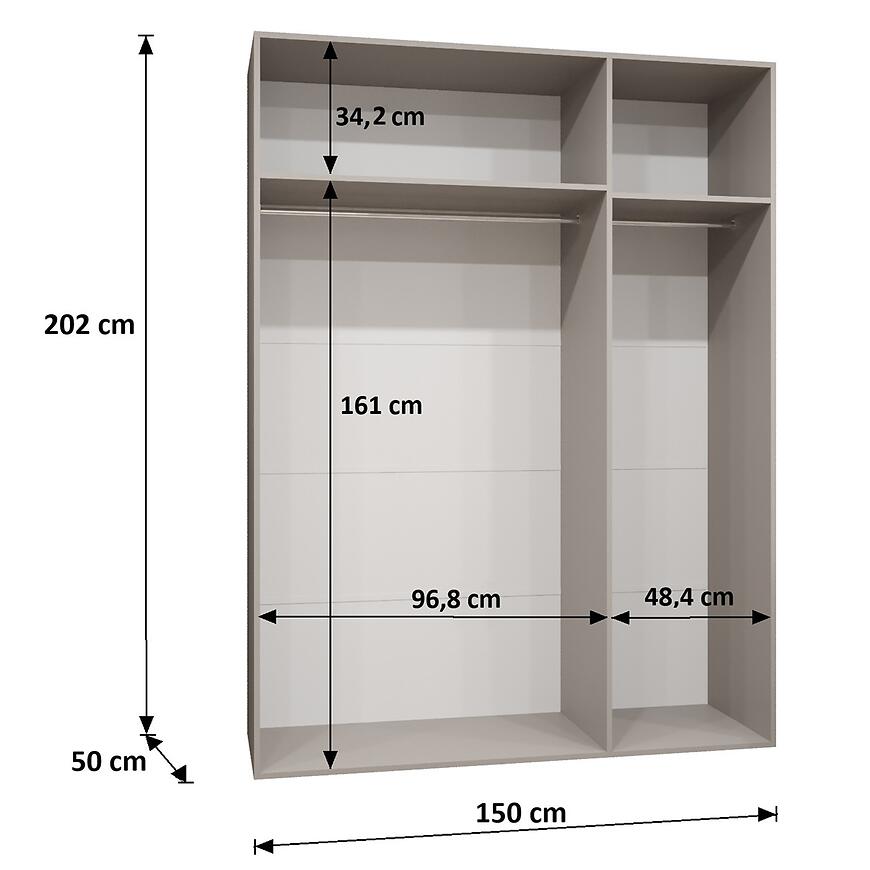 Szerokość 150 cm, wysokość 202 cm i głębokość 52 cm zapewniają wygodne miejsce do przechowywania ubrań, pościeli i dodatków. Trzydrzwiowa konstrukcja pozwala na logiczny podział wnętrza i komfortowy dostęp do wszystkich segmentów szafy.