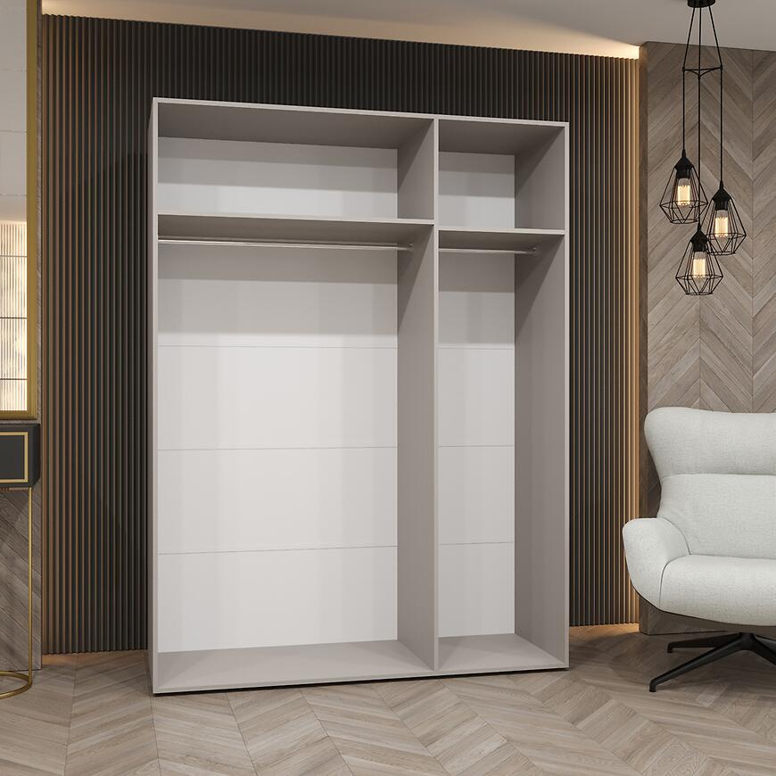 Szafa Piano 2-150 kaszmir/złoty to połączenie subtelnego odcienia kaszmiru z eleganckim złotym detalem, które nadają wnętrzu nowoczesnego i luksusowego charakteru. Połyskujące fronty w zestawieniu z matowym korpusem tworzą stylową, spójną całość, a wbudowane lustro optycznie powiększa przestrzeń i zwiększa funkcjonalność mebla.