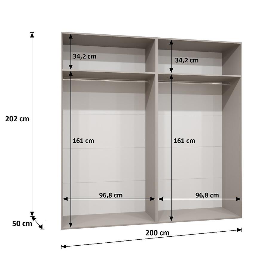 Szafa Piano 2-200 o szerokości 200 cm i wysokości 202 cm łączy nowoczesny design z funkcjonalnością. Białe fronty w połysku kontrastują z matowym korpusem, nadając meblowi elegancki i lekki charakter. Prosta konstrukcja szafy pasuje do różnych aranżacji wnętrz, a lustro na frontach optycznie powiększa przestrzeń.