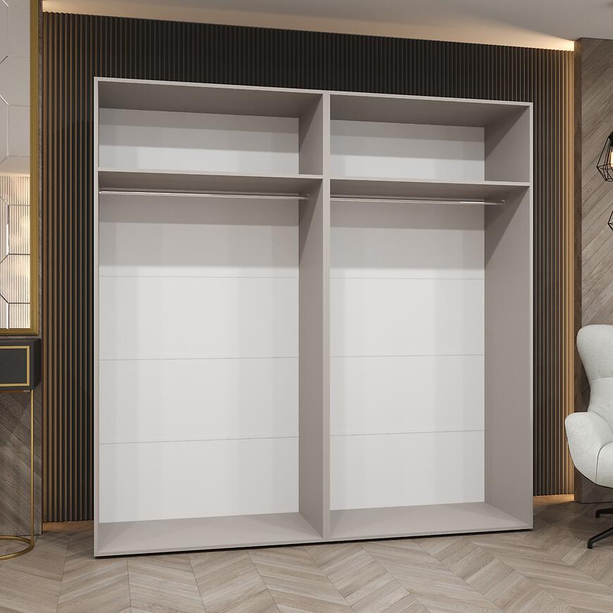 Szafa Piano 2-200 o szerokości 200 cm i wysokości 202 cm łączy nowoczesny design z funkcjonalnością. Białe fronty w połysku kontrastują z matowym korpusem, nadając meblowi elegancki i stylowy charakter. Prosta konstrukcja szafy sprawia, że pasuje do różnych aranżacji wnętrz, a lustro na frontach optycznie powiększa przestrzeń.