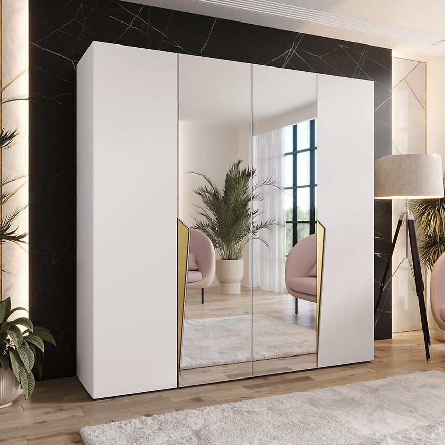 Połączenie białych, połyskujących frontów z matowym korpusem nadaje szafie Piano elegancki charakter. Lustro na frontach zwiększa funkcjonalność i wprowadza więcej światła do wnętrza, czyniąc szafę praktycznym i dekoracyjnym elementem wyposażenia.