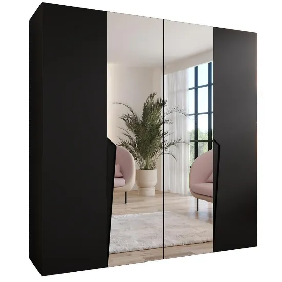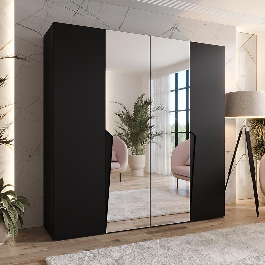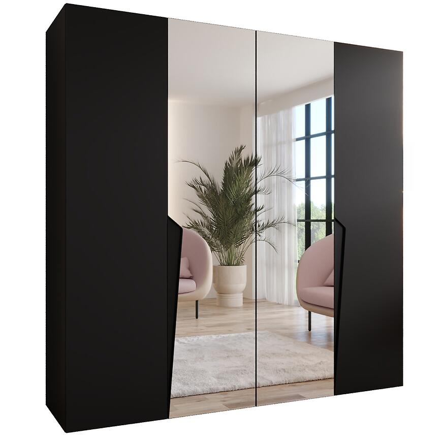 Szafa Piano 2-200 o szerokości 200 cm i wysokości 202 cm łączy nowoczesny design z funkcjonalnością. Czarne fronty w połysku kontrastują z matowym korpusem, nadając meblowi elegancki i wyrazisty charakter. Prosta konstrukcja szafy pasuje do różnych aranżacji wnętrz, a lustro na frontach optycznie powiększa przestrzeń.
