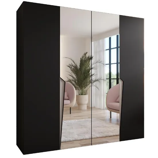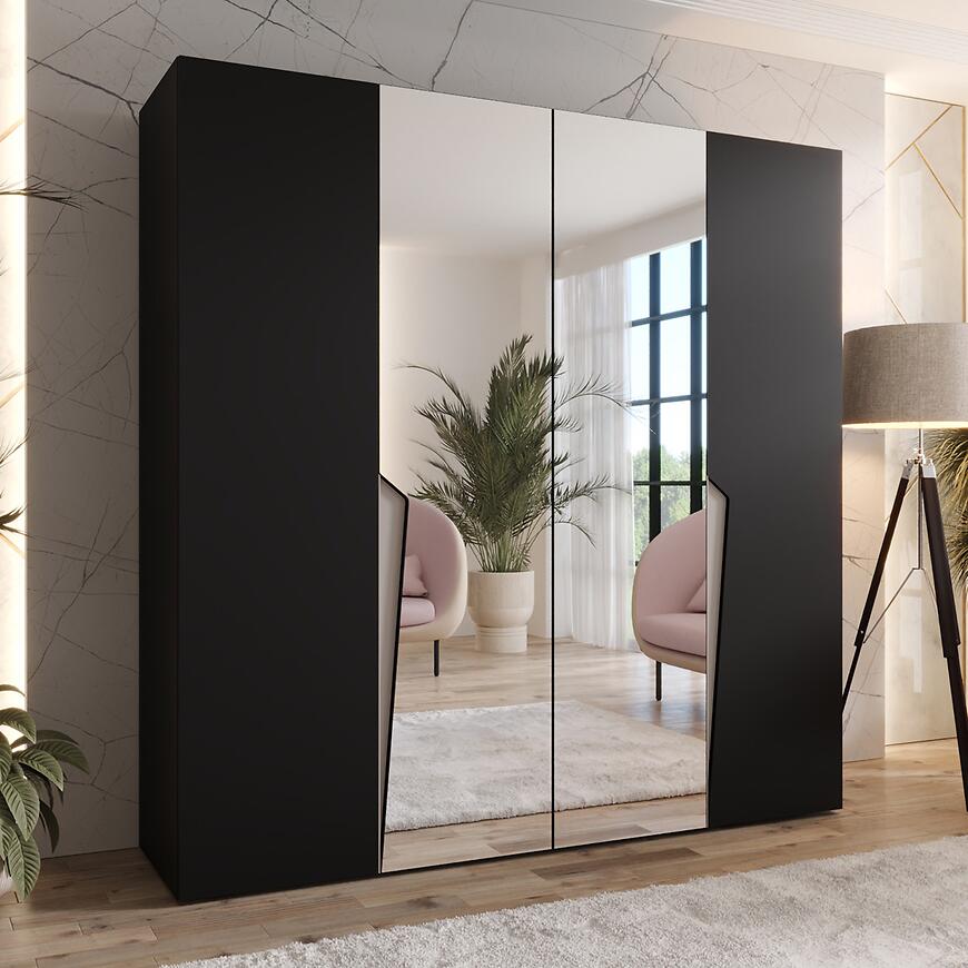 Szafa Piano 2-200 o szerokości 200 cm i wysokości 202 cm łączy nowoczesny design z funkcjonalnością. Czarne fronty w połysku kontrastują z matowym korpusem, nadając meblowi elegancki i wyrafinowany charakter. Prosta konstrukcja szafy pasuje do różnych aranżacji wnętrz, a lustro na frontach optycznie powiększa przestrzeń.