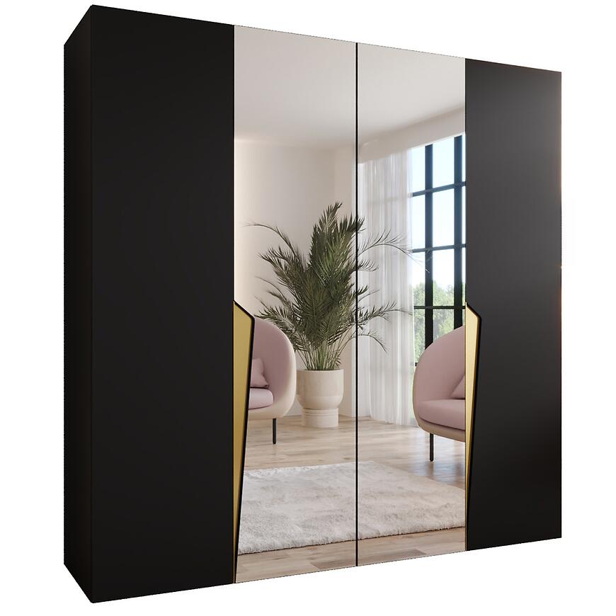 Szafa Piano 2-200 o szerokości 200 cm i wysokości 202 cm łączy nowoczesny design z funkcjonalnością. Czarne fronty w połysku kontrastują z matowym korpusem, nadając meblowi elegancki i luksusowy charakter. Prosta konstrukcja szafy pasuje do różnych aranżacji wnętrz, a lustro na frontach optycznie powiększa przestrzeń.