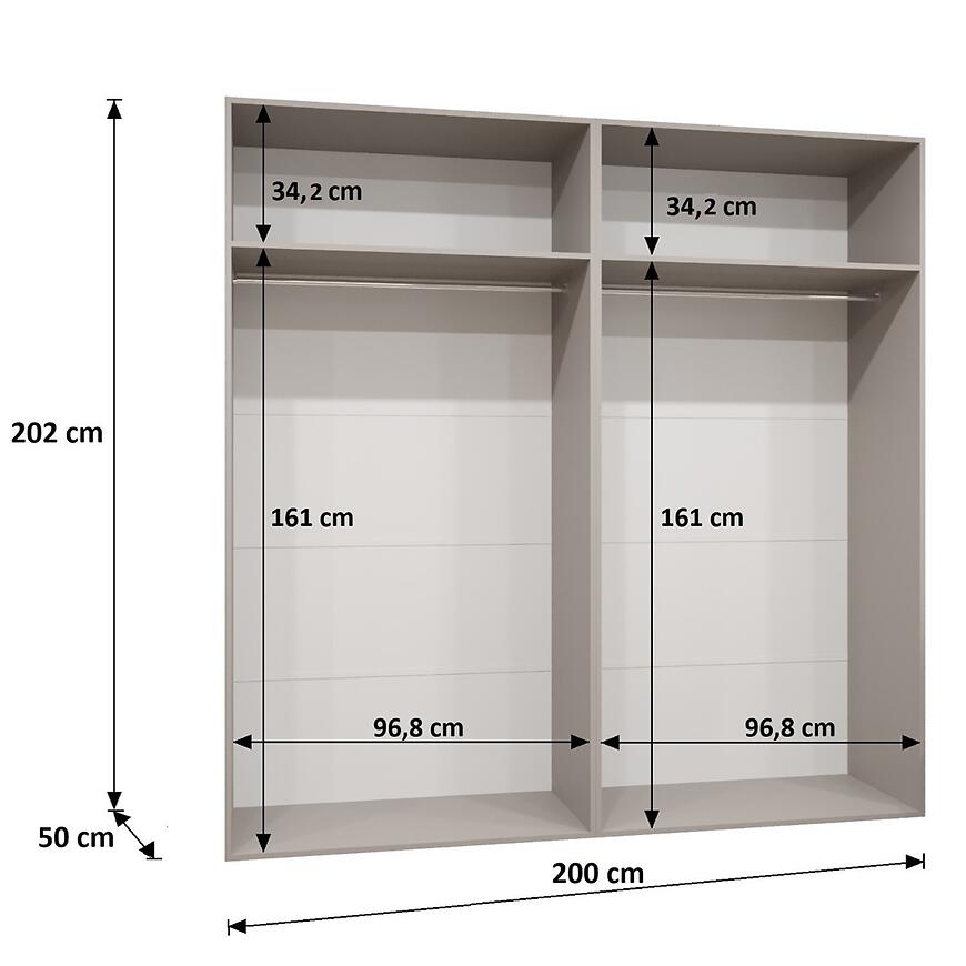 Szafa Piano 2-200 o szerokości 200 cm i wysokości 202 cm łączy nowoczesny design z funkcjonalnością. Fronty w kolorze kaszmir w połysku kontrastują z matowym korpusem, nadając meblowi elegancki i wyrafinowany charakter. Prosta konstrukcja szafy sprawia, że pasuje do różnych aranżacji wnętrz, a lustro na frontach optycznie powiększa przestrzeń.