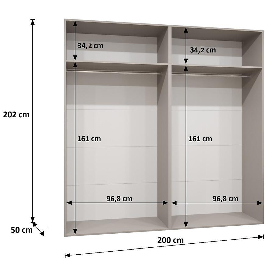 Szafa Piano 2-200 o szerokości 200 cm i wysokości 202 cm łączy nowoczesny design z funkcjonalnością. Fronty w kolorze kaszmir w połysku kontrastują z matowym korpusem, nadając meblowi elegancki i luksusowy charakter. Prosta konstrukcja szafy pasuje do różnych aranżacji wnętrz, a lustro na frontach optycznie powiększa przestrzeń.