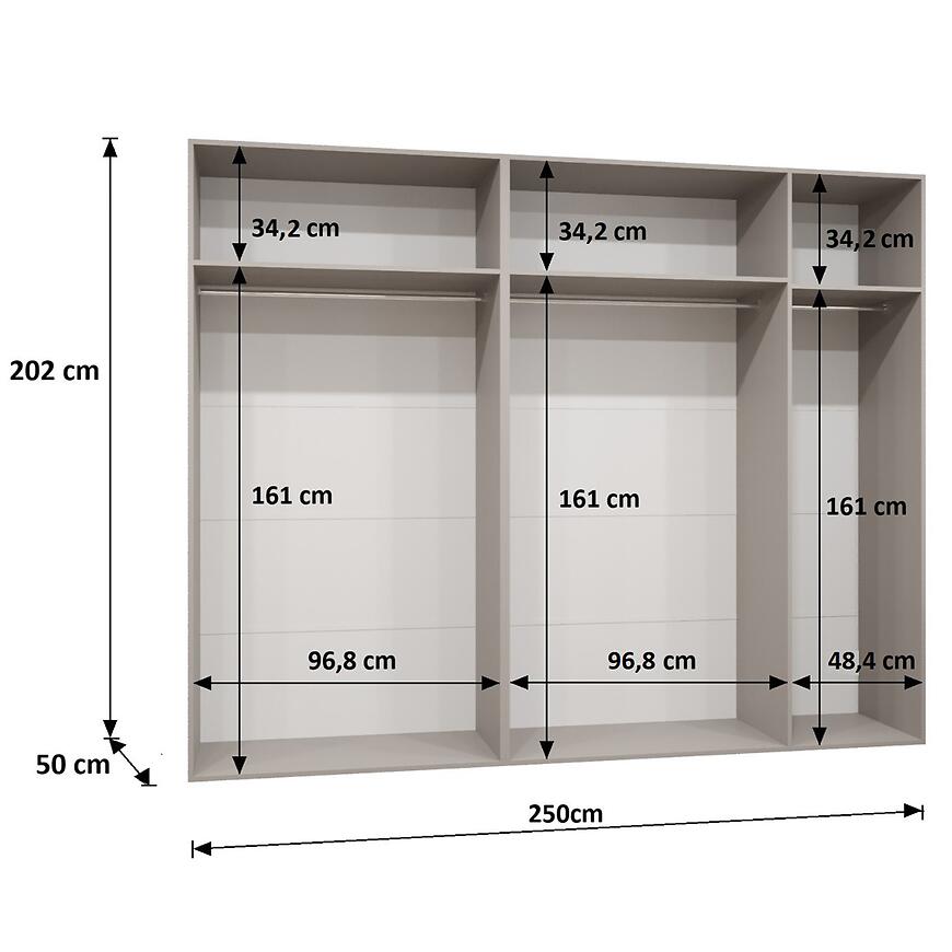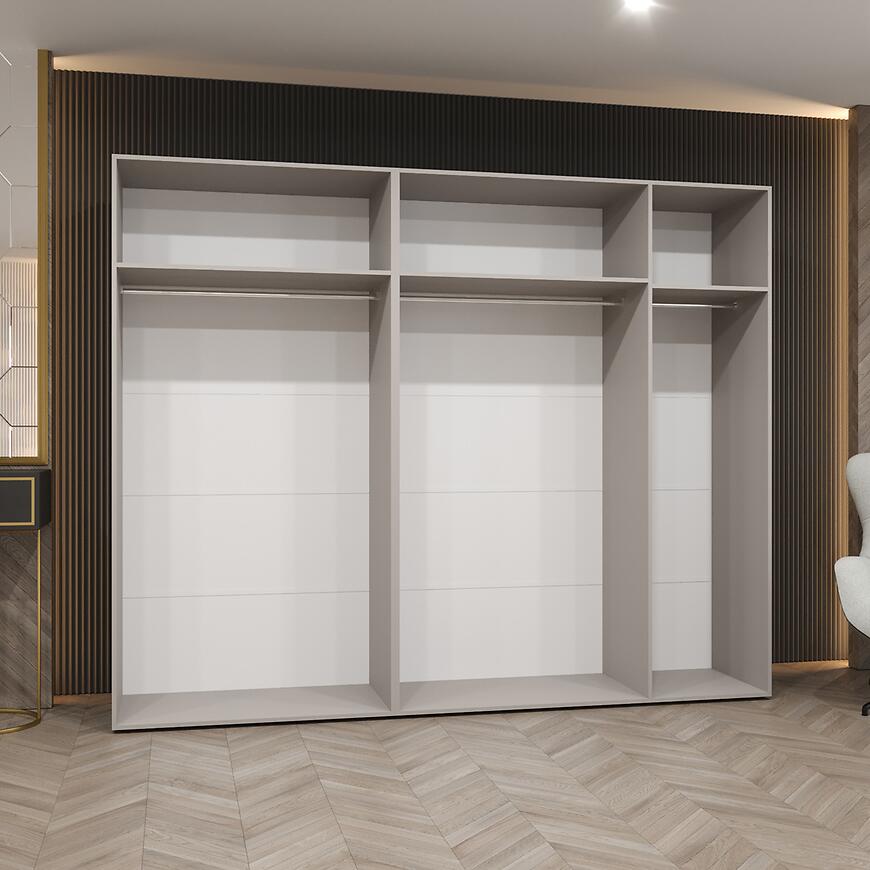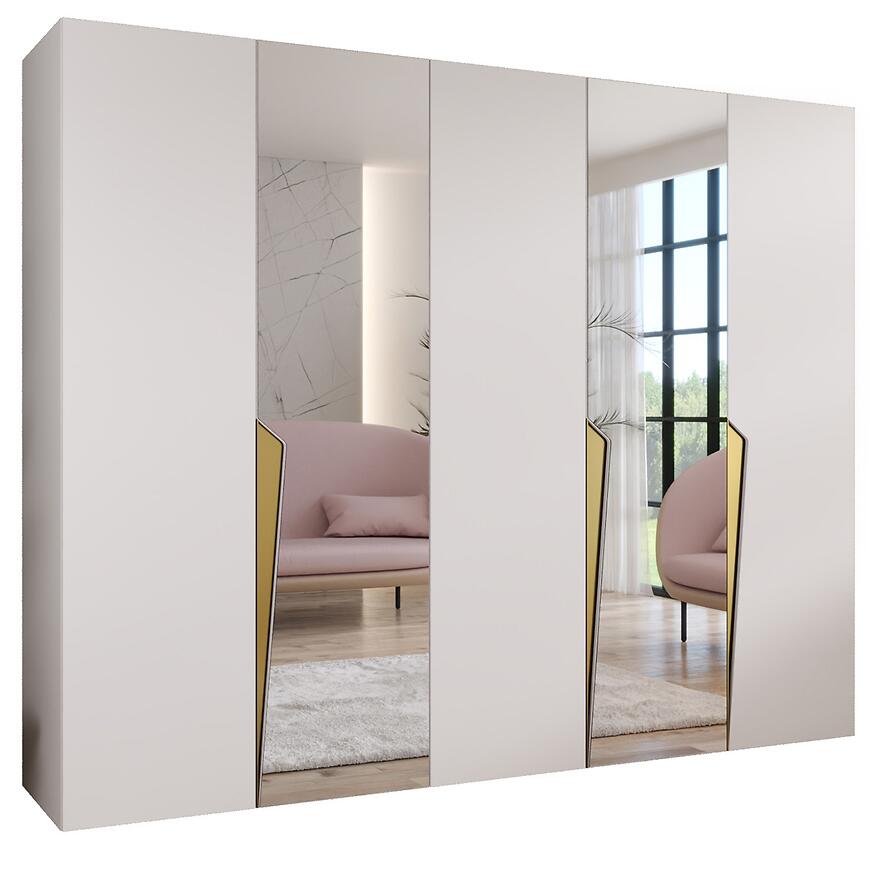 Szafa Piano 2-250 o szerokości 250 cm i wysokości 202 cm łączy nowoczesny design z praktyczną funkcjonalnością. Białe fronty w połysku kontrastują z matowym korpusem, nadając meblowi elegancki i luksusowy charakter. Prosta konstrukcja pasuje do różnych aranżacji wnętrz, a lustro na frontach optycznie powiększa przestrzeń.