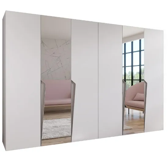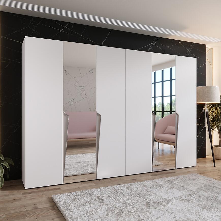 Szafa Piano 2-300 o szerokości 300 cm i wysokości 202 cm łączy nowoczesny design z funkcjonalnością. Połączenie białych frontów w połysku z matowym korpusem w kaszmirze nadaje meblowi elegancki i harmonijny charakter. Prosta konstrukcja sprawdza się w różnych aranżacjach wnętrz, a lustro na frontach optycznie powiększa przestrzeń.