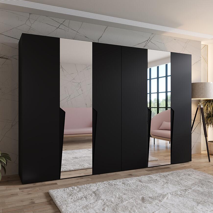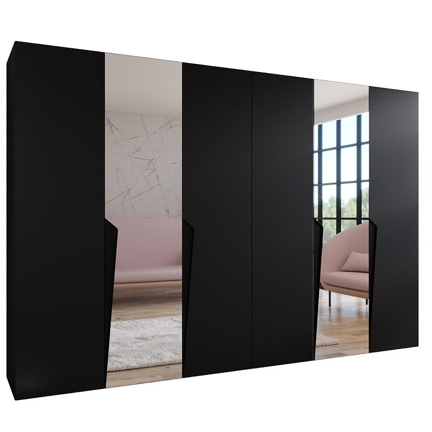 Szafa Piano 2-300 o szerokości 300 cm i wysokości 202 cm łączy nowoczesny design z dużą funkcjonalnością. Czarne fronty w połysku zestawione z matowym korpusem nadają meblowi elegancki i wyrafinowany charakter. Prosta konstrukcja sprawdza się w różnych aranżacjach wnętrz, a lustro na frontach optycznie powiększa przestrzeń.