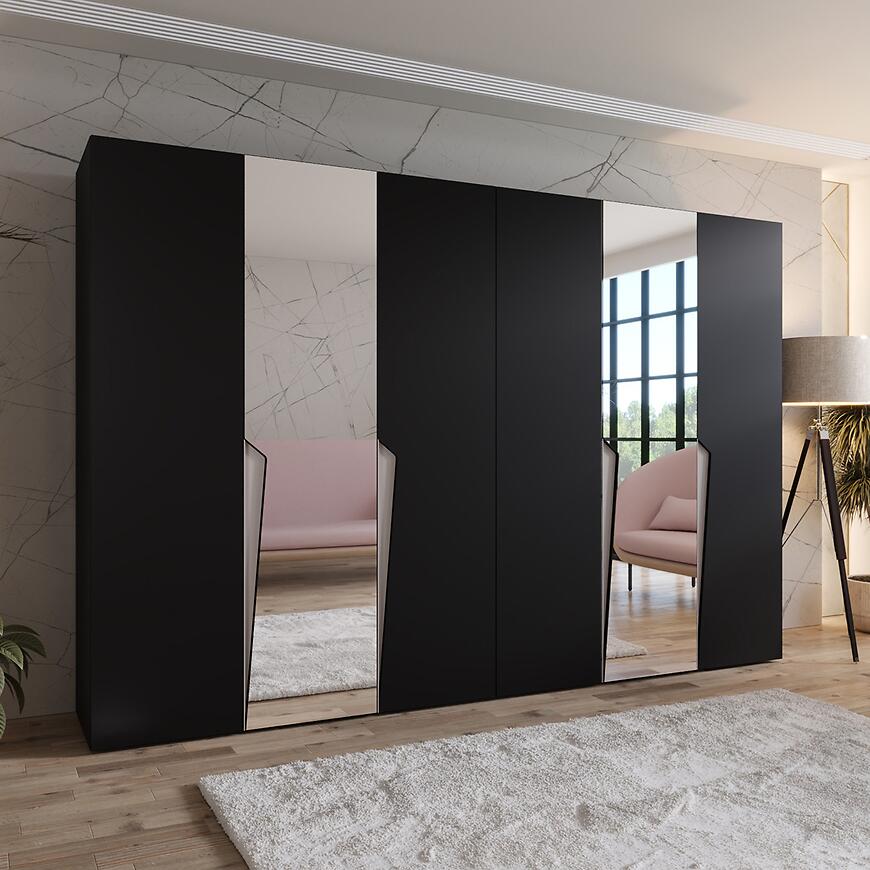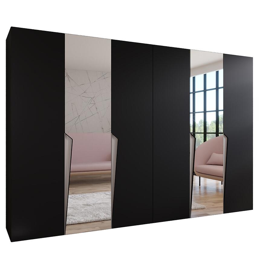 Szafa Piano 2-300 o szerokości 300 cm i wysokości 202 cm łączy nowoczesny design z funkcjonalnością. Czarne fronty w połysku połączone z matowym korpusem w kaszmirze nadają meblowi elegancki i wyrafinowany charakter. Prosta konstrukcja sprawdza się w różnych aranżacjach wnętrz, a lustro na frontach optycznie powiększa przestrzeń.