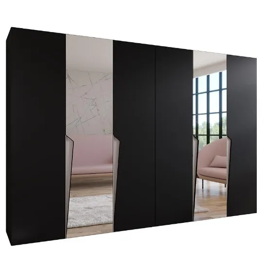Połączenie czarnych frontów w połysku z matowym korpusem w kaszmirze nadaje szafie Piano nowoczesny i stylowy charakter. Lustro na frontach zwiększa funkcjonalność i wprowadza więcej światła do wnętrza, czyniąc szafę praktycznym i dekoracyjnym elementem wyposażenia mieszkania.