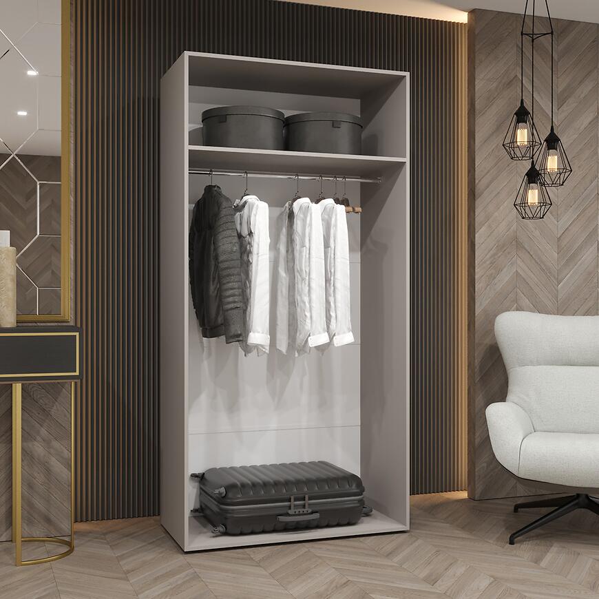 Wymiary 100 × 202 × 52 cm umożliwiają wygodne przechowywanie odzieży wiszącej i składanej. Szafa dostarczana jest do samodzielnego montażu.