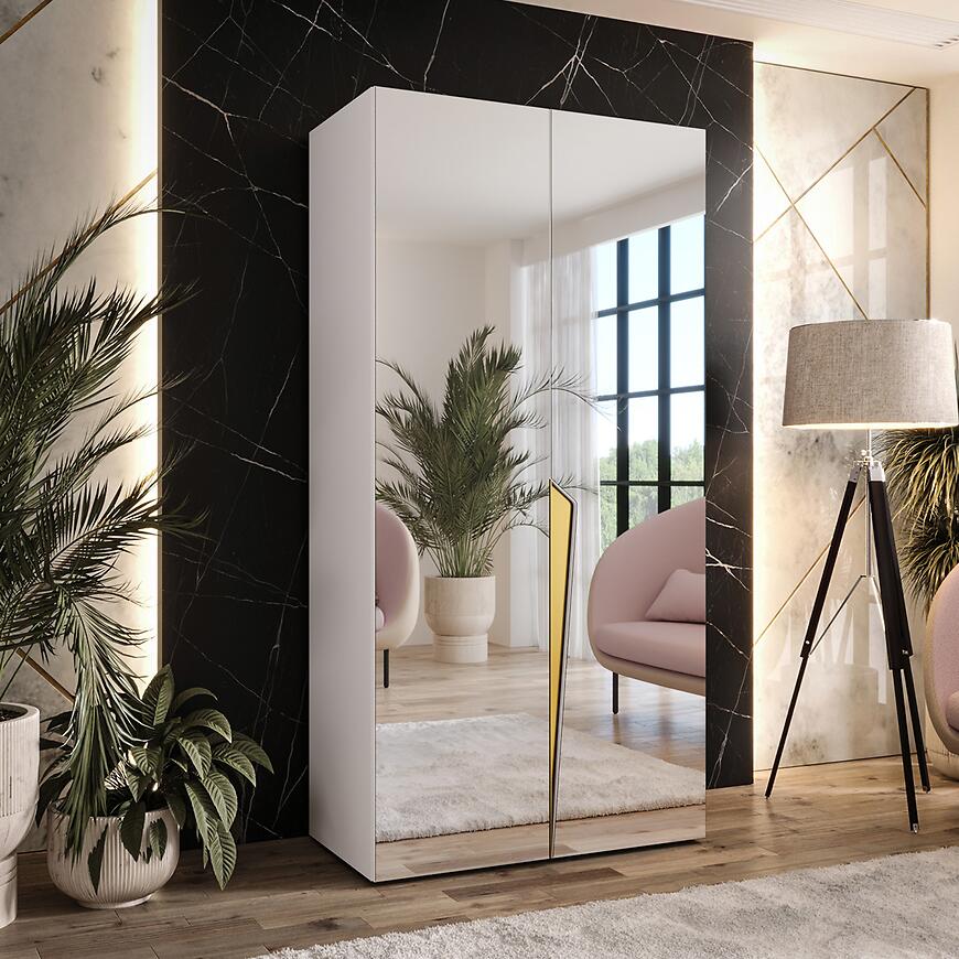 Szafa Piano 3-100 biały/złoty to kompaktowy, elegancki mebel, który sprawdzi się w sypialni, garderobie. Połączenie białych frontów w połysku ze złotymi detalami nadaje wnętrzu nowoczesny i luksusowy wygląd. Dwudrzwiowa konstrukcja oferuje wygodną przestrzeń do przechowywania odzieży, dodatków i tekstyliów.