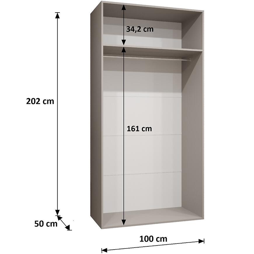 Wymiary 100 × 202 × 52 cm pozwalają na wygodne przechowywanie ubrań wiszących i składanych, a kompaktowa szerokość sprawia, że mebel sprawdzi się również w mniejszych pomieszczeniach. Szafa przeznaczona jest do samodzielnego montażu.