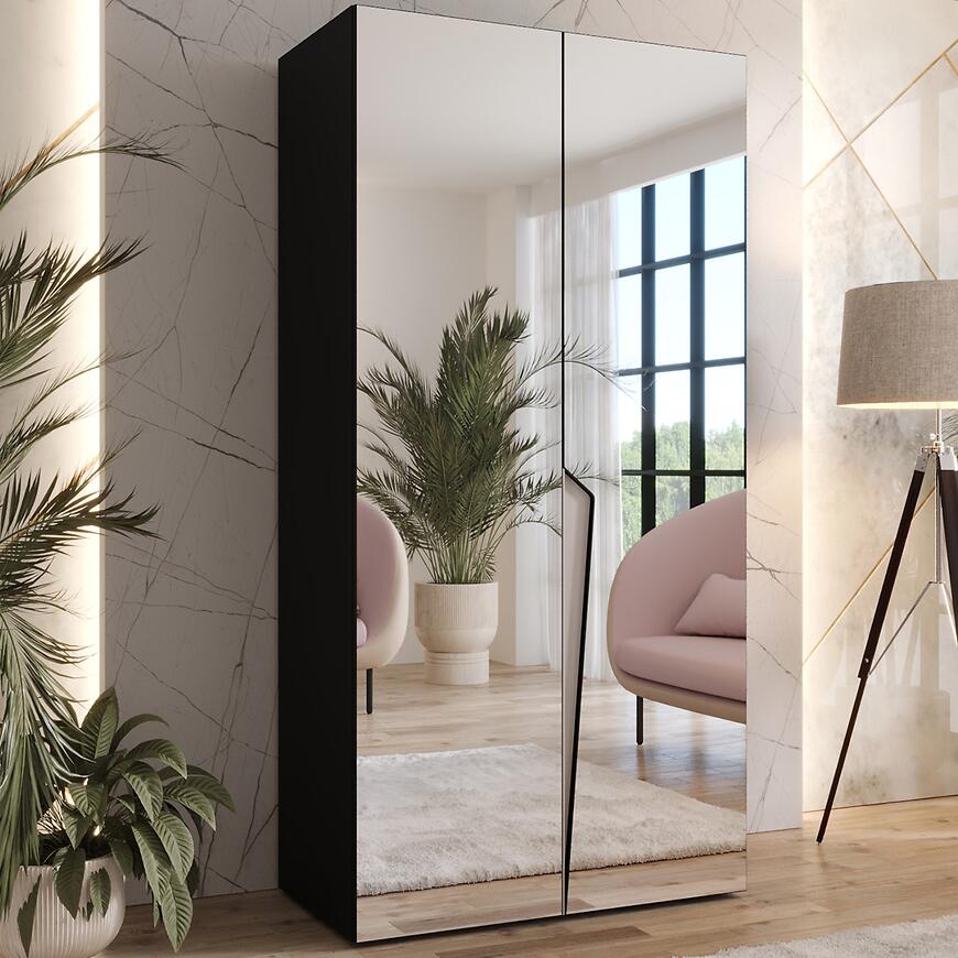 Model wyposażony jest w klasyczne drzwi oraz praktyczne lustro, które optycznie powiększa przestrzeń i ułatwia codzienne przygotowanie stylizacji. Prosta forma sprawia, że szafa świetnie wpisuje się w nowoczesne i minimalistyczne aranżacje wnętrz.