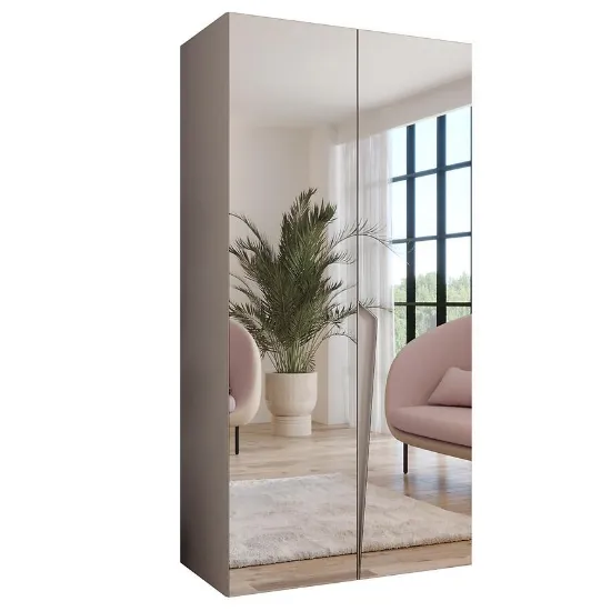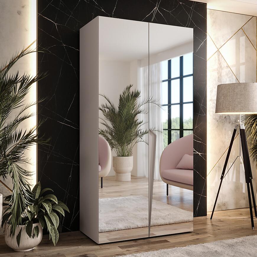 Model wyposażony jest w klasyczne, dwudrzwiowe skrzydła oraz praktyczne lustro, które ułatwia codzienne przygotowanie stylizacji i jednocześnie optycznie powiększa przestrzeń. Prosta forma oraz uniwersalna kolorystyka sprawiają, że szafa łatwo dopasowuje się do różnych aranżacji wnętrz.