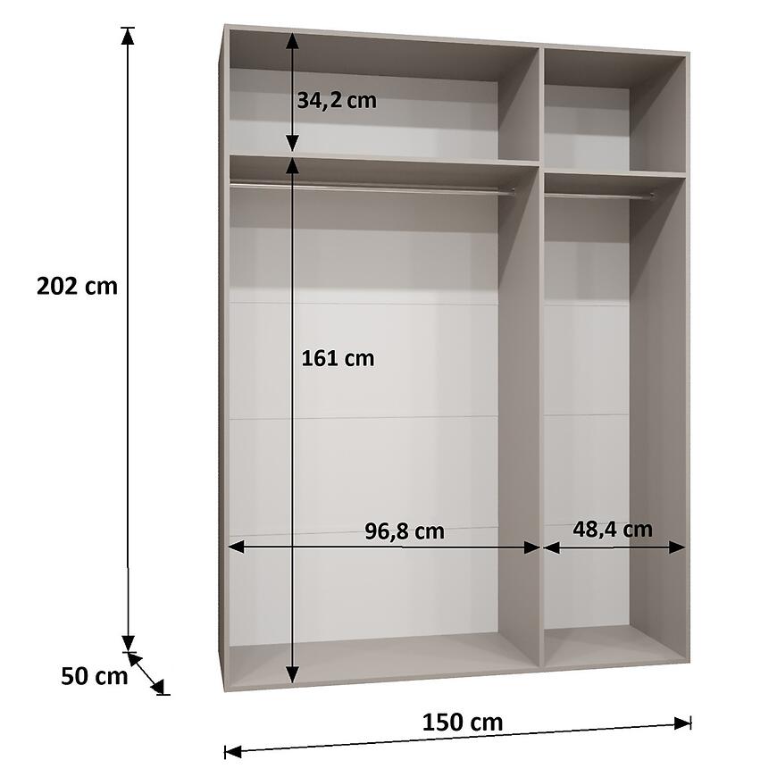 Wymiary 150 × 202 × 52 cm umożliwiają wygodne przechowywanie odzieży wiszącej i składanej. Szafa dostarczana jest do samodzielnego montażu.