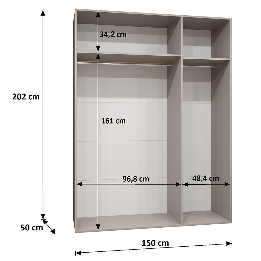 Wymiary 150 × 202 × 52 cm umożliwiają wygodne przechowywanie odzieży wiszącej i składanej. Szafa dostarczana jest do samodzielnego montażu.