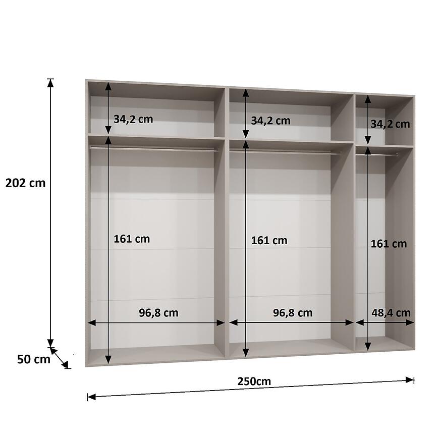 Wymiary 250 × 202 × 52 cm umożliwiają wygodne przechowywanie odzieży wiszącej i składanej. Szafa dostarczana jest do samodzielnego montażu.