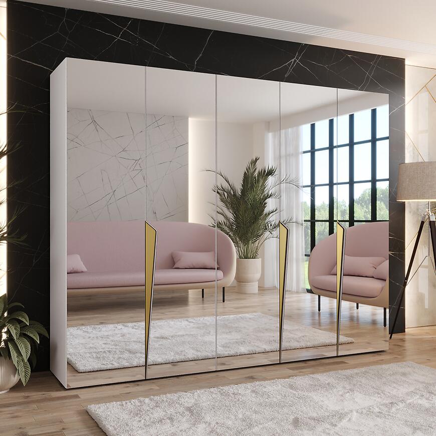 Model wyposażony jest w klasyczne, kilkudrzwiowe drzwi oraz praktyczne lustro, które optycznie powiększa przestrzeń i ułatwia codzienne przygotowanie stylizacji. Prosty kształt szafy pozwala dopasować ją do nowoczesnych, minimalistycznych oraz eleganckich aranżacji wnętrz.