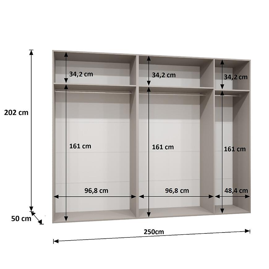 Wymiary 250 × 202 × 52 cm umożliwiają wygodne przechowywanie odzieży wiszącej i składanej. Szafa dostarczana jest do samodzielnego montażu.