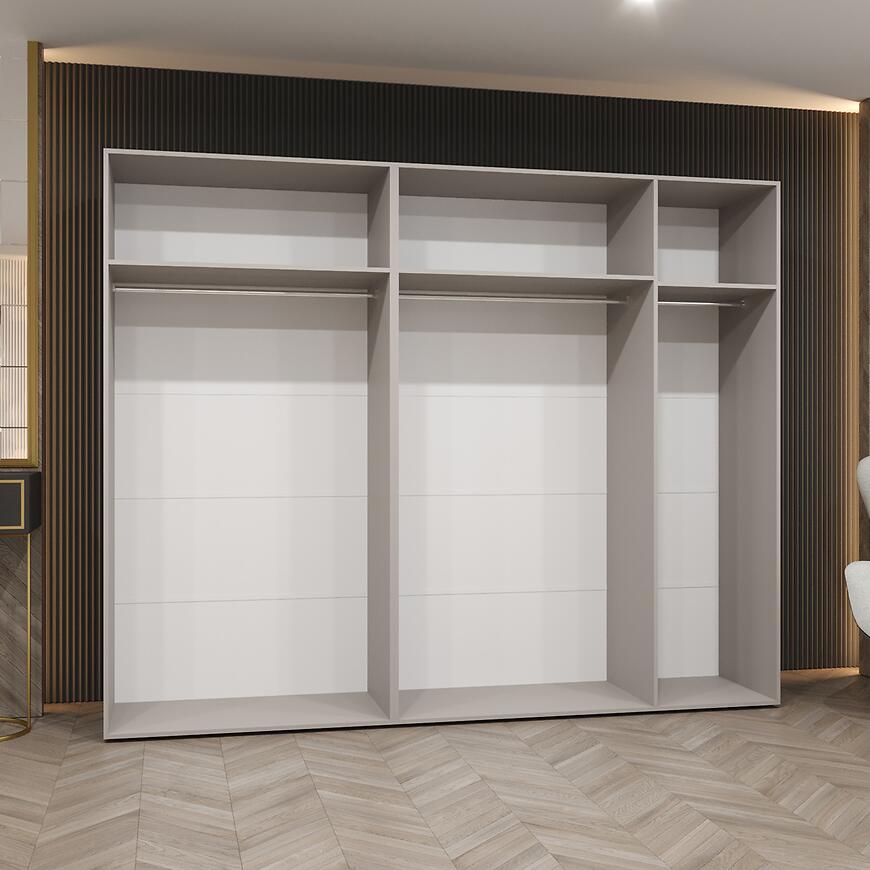 Szafa Piano 3-250 kaszmir/czarny to elegancki i praktyczny mebel, który sprawdzi się w sypialni, garderobie. Połączenie frontów w kolorze kaszmir w połysku z czarnymi detalami nadaje wnętrzu nowoczesny i stylowy charakter. Szerokość 250 cm zapewnia wygodną powierzchnię do przechowywania ubrań, dodatków i tekstyliów.