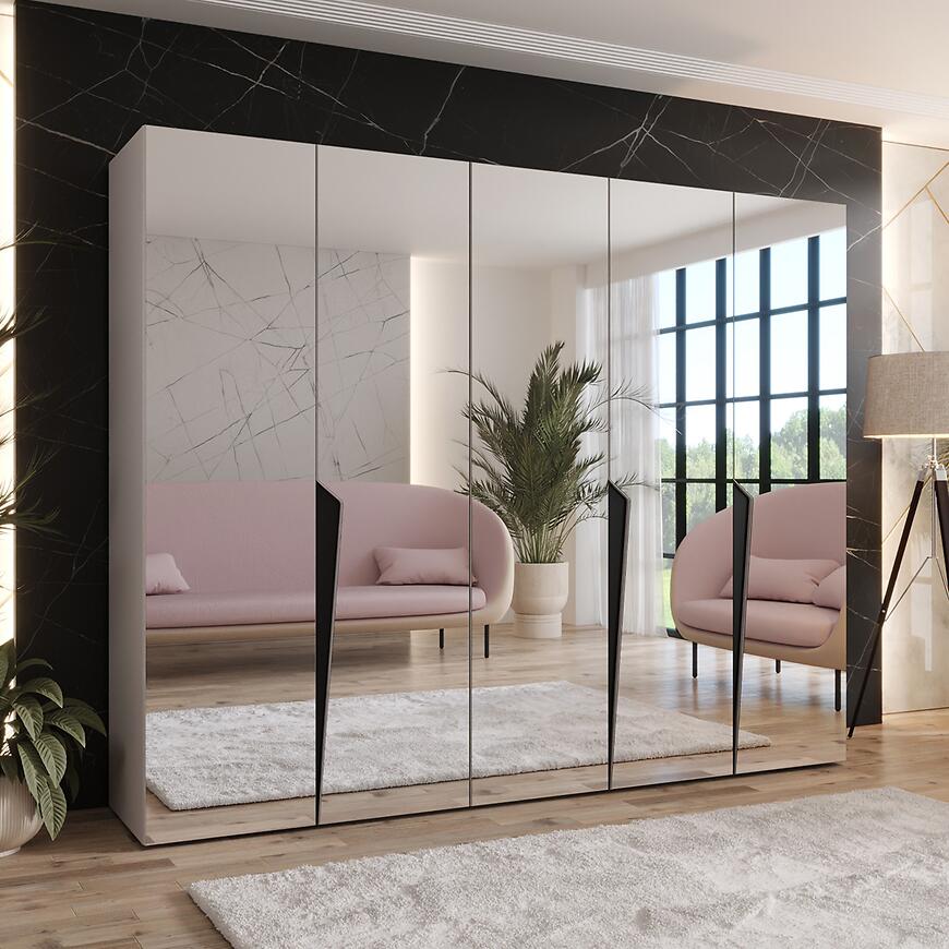 Model wyposażony jest w klasyczne, kilkudrzwiowe drzwi oraz praktyczne lustro, które optycznie powiększa przestrzeń i ułatwia codzienne przygotowanie stylizacji. Prosta forma szafy pozwala dopasować ją do nowoczesnych, minimalistycznych i eleganckich aranżacji wnętrz.