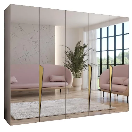 Model wyposażony jest w klasyczne, kilkudrzwiowe drzwi oraz praktyczne lustro, które optycznie powiększa przestrzeń i ułatwia codzienne przygotowanie stylizacji. Prosta forma szafy pozwala dopasować ją do nowoczesnych, minimalistycznych i eleganckich aranżacji wnętrz.