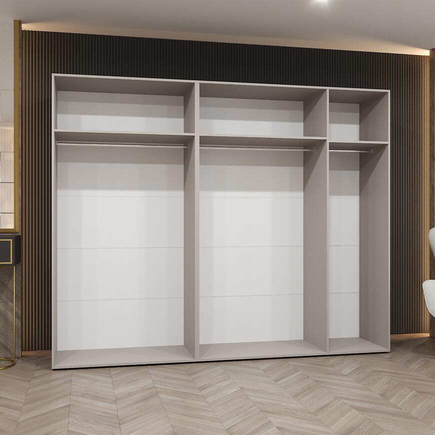 Szafa Piano 3-250 kaszmir/złoty to elegancki i przestronny mebel, który świetnie sprawdzi się w sypialni, garderobie. Modny odcień kaszmiru w połączeniu ze złotymi detalami tworzy subtelny i luksusowy akcent we wnętrzu. Szerokość 250 cm zapewnia praktyczną powierzchnię do przechowywania ubrań, dodatków i tekstyliów.