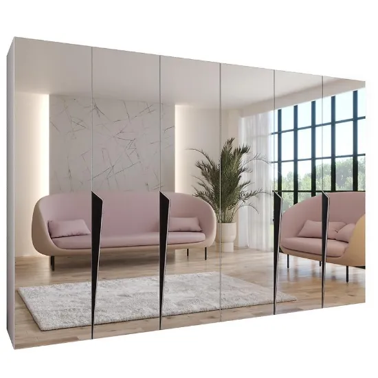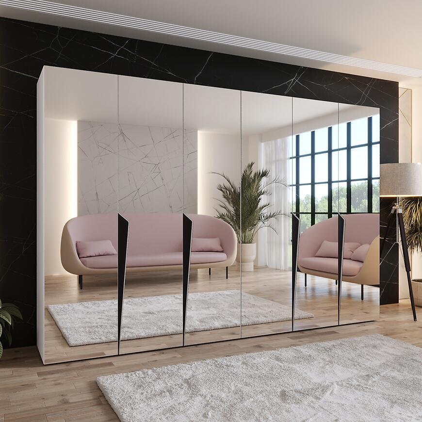 Szafa Piano 3-300 o szerokości 300 cm i wysokości 202 cm łączy elegancki design z praktycznym przechowywaniem. Białe fronty w połysku zestawione z matowym korpusem w czarnym kolorze tworzą nowoczesny kontrast, który pasuje do różnych aranżacji wnętrz. Lustra na frontach optycznie powiększają przestrzeń i dodają wnętrzu światła.