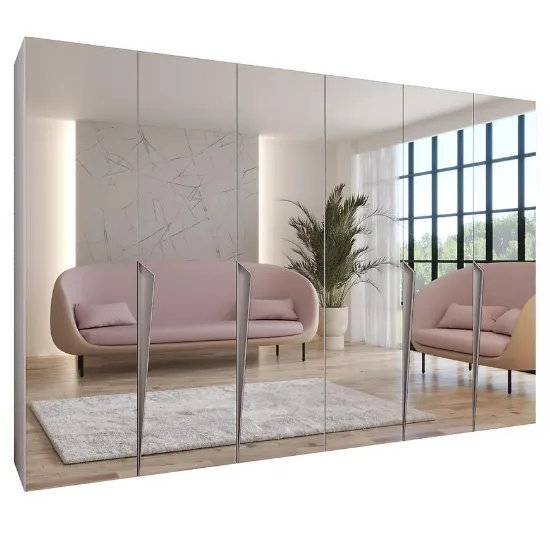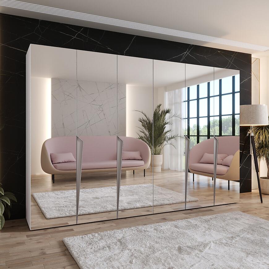 Model posiada klasyczne, kilkudrzwiowe drzwi oraz praktyczne lustro, które optycznie powiększa przestrzeń i ułatwia codzienne przygotowanie stylizacji. Prosta forma szafy pozwala na łatwe dopasowanie jej do nowoczesnych, minimalistycznych i eleganckich wnętrz.