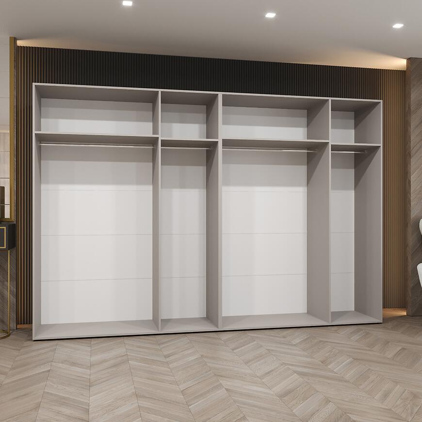 Szafa Piano 3-300 biały/kaszmir to elegancki i pojemny mebel, który świetnie sprawdzi się w sypialni, garderobie. Połączenie białych frontów w połysku z subtelnym odcieniem kaszmiru nadaje wnętrzu lekkości i nowoczesnego charakteru. Szerokość 300 cm zapewnia przestrzeń do przechowywania ubrań, dodatków i tekstyliów.