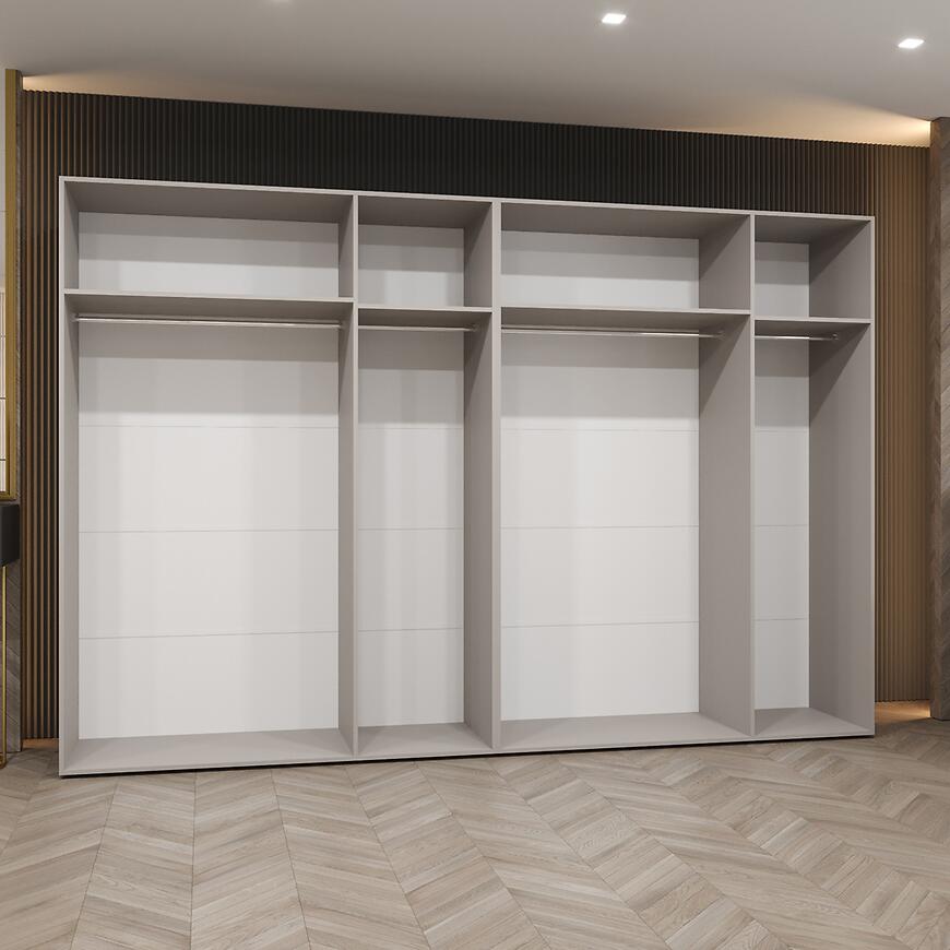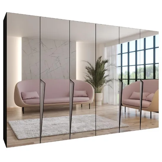 Model wyposażony jest w klasyczne, kilkudrzwiowe skrzydła oraz lustro, które optycznie powiększa przestrzeń i ułatwia codzienne przygotowanie stylizacji. Prosta forma szafy pozwala dopasować ją do nowoczesnych i eleganckich aranżacji wnętrz.