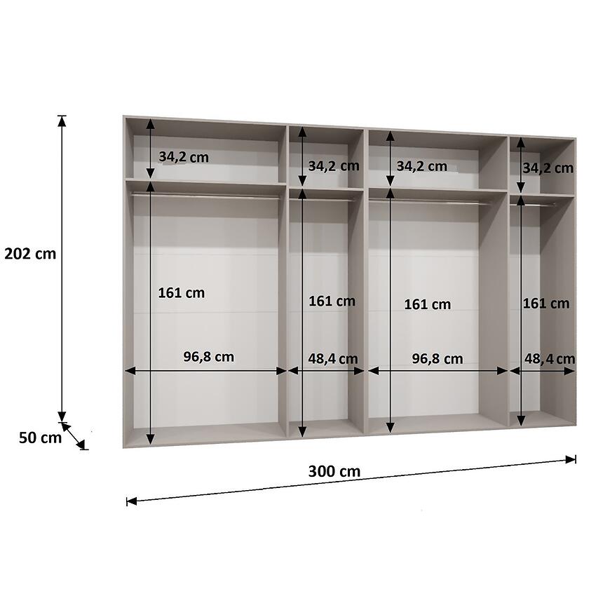 Wymiary 300 × 202 × 52 cm umożliwiają wygodne przechowywanie odzieży wiszącej i składanej. Szafa dostarczana jest do samodzielnego montażu.