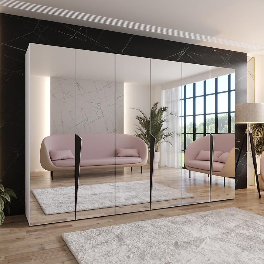 Szafa Piano 3-300 (3x100) o szerokości 300 cm i wysokości 202 cm łączy elegancki design z funkcjonalnym przechowywaniem. Białe fronty w połysku w połączeniu z matowym czarnym korpusem tworzą nowoczesny kontrast, który pasuje do różnych wnętrz. Lustra na frontach optycznie powiększają przestrzeń i dodają światła w pomieszczeniu.