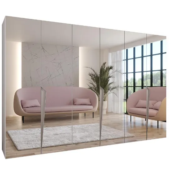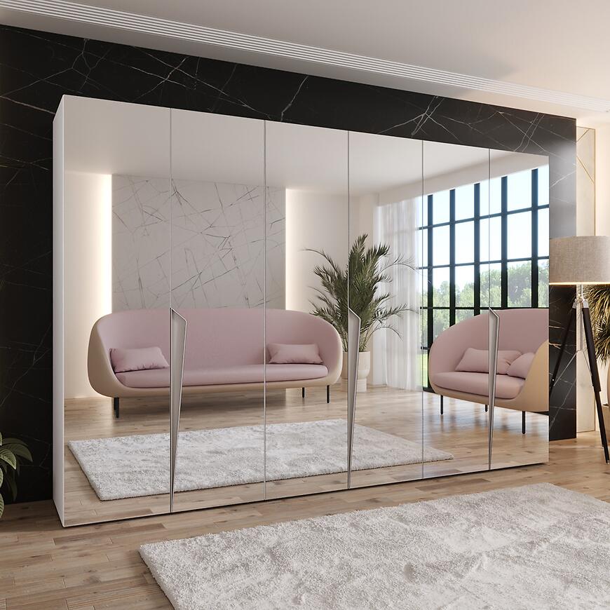 Model wyposażony jest w klasyczne, kilkudrzwiowe drzwi oraz praktyczne lustro, które optycznie powiększa przestrzeń i ułatwia codzienne przygotowanie stylizacji. Prosta forma szafy sprawia, że łatwo dopasować ją do nowoczesnych i eleganckich wnętrz.