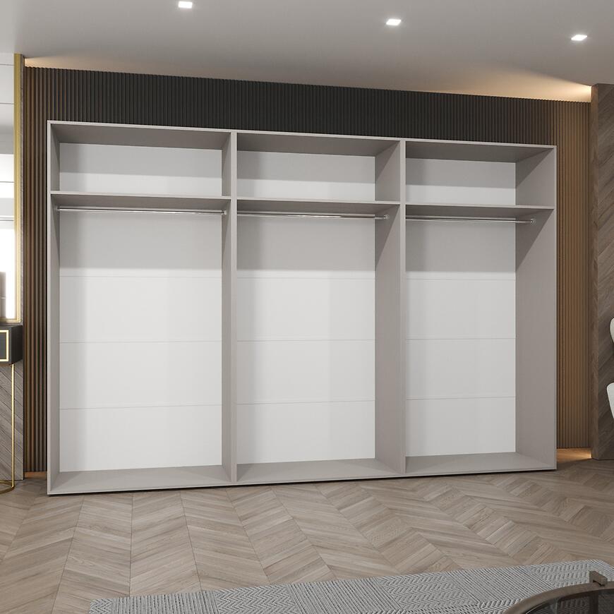 Szafa Piano 3-300 biały/kaszmir to elegancki i pojemny mebel, który doskonale sprawdzi się w sypialni, garderobie. Połączenie białych frontów w połysku z subtelnym odcieniem kaszmiru wprowadza lekkość i nowoczesny charakter do wnętrza. Szerokość 300 cm zapewnia dużą powierzchnię do przechowywania ubrań, dodatków i tekstyliów.