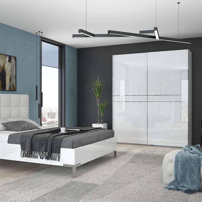 Dwudrzwiowa szafa Piano to doskonała propozycja do sypialni czy też do przedpokoju w stylu nowoczesnym. Fronty szafy wykonane są w kolorze białym. Całość w połysku. Szafa posiada wygodne w użytkowaniu i nie zabierające miejsca- drzwi przesuwne.