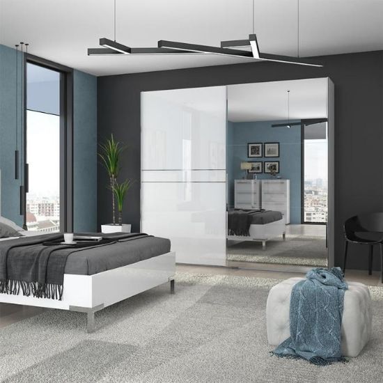Dwudrzwiowa szafa Piano z lustrem to doskonała propozycja do sypialni czy też do przedpokoju w stylu nowoczesnym. Jeden front wykonany w kolorze białym, a drugi to lustro. Całość wykonana w połysku. Szafa posiada wygodne w użytkowaniu i nie zabierające miejsca- drzwi przesuwne.