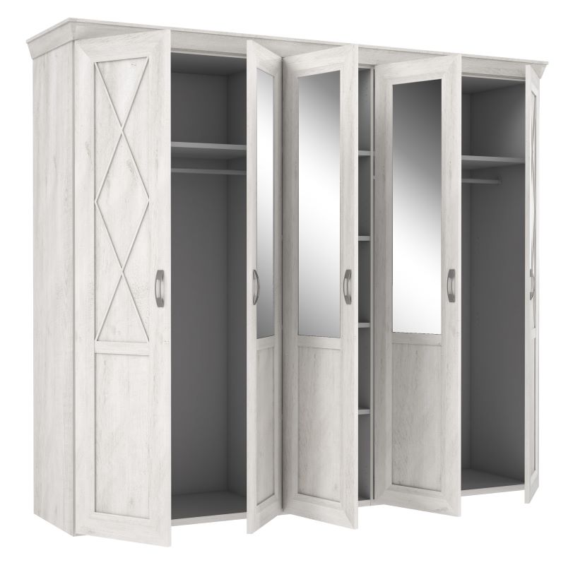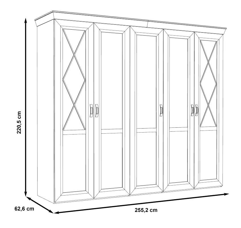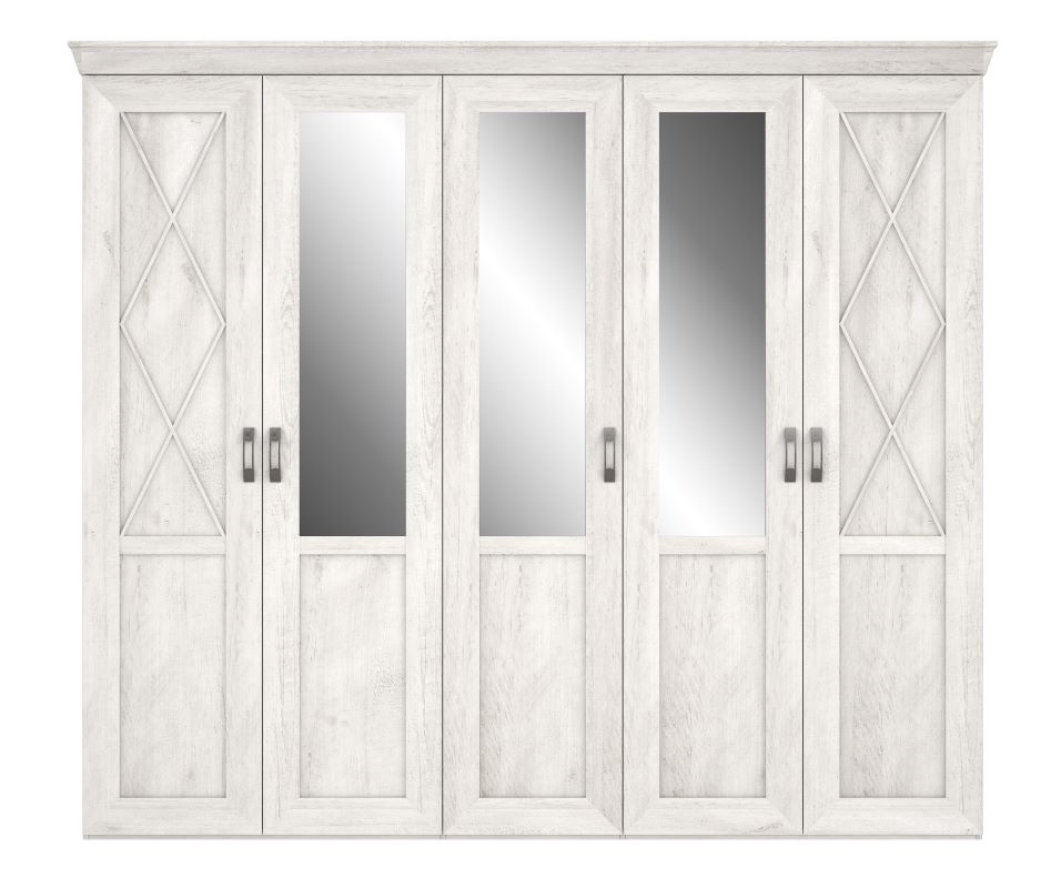 Szafa pięciodrzwiowa Kashmir KSMS955S3-D43 z powodzeniem może pełnić funkcje garderoby. Dostępna w dekorze Pinia Biała. Szafa posiada bogate zdobienia, ramkowe fronty oraz szprosy na frontach. Wnętrze szafy zostało podzielone na trzy części - dwie zewnętrzne są wyposażone w drążek na ubrania i górną półkę, środkowa wąska część pełni funkcję bieliźniarki wyposażona jest w cztery półki. Na środkowych drzwiach umieszczone zostały trzy duże lustra. Szafa posiada dwa drążki ubraniowe o długości 97 cm. Maksymalne dopuszczalne obciążenie drążka ubraniowego to 15 kg. Metalowy uchwyt w kolorze imitującym stare srebro nadają szafie niepowtarzalnego charakteru. Szafę należy zamontować do ściany (potrzebne okucia dołączone są do mebla).