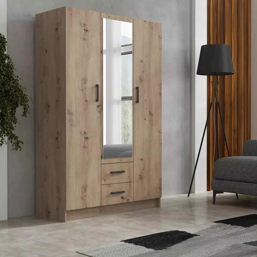 Szafa uchylna Pino to propozycja do pokoju dziennego, ale znajdzie swoje miejsce również w innym pomieszczeniu, jak na przykład - przedpokój czy garderobie. Materiał wykonania to płyta wiórowa laminowana. Szafa posiada półki, szuflady oraz drążek na ubrania. Mebel posiada lustro, które sprawi, że pomieszczenie stanie się optycznie większe. Nowoczesny styl mebli wpadnie do gustu każdemu, kto poszukuje eleganckiego, klasycznego, a zarazem nowoczesnego umeblowania. Idealnie wpasuje się w większość aranżacji. Przeznaczona do samodzielnego montażu.